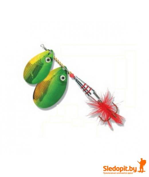 Эта двойная тандемная блесна экстра-класса является одной из самых удачных разработок компании Zebco, известного в мире производителя рыболовных снастей. Два один за другим расположеных лепестка работают асинхронно, т.е. не одинаково увеличивая визуально приманку при движении в воде. Красная мушка маскирует крючок и визуально при движении в воде выглядит как красных хвостик рыбки. Идеально подходит для ловли щуки.
