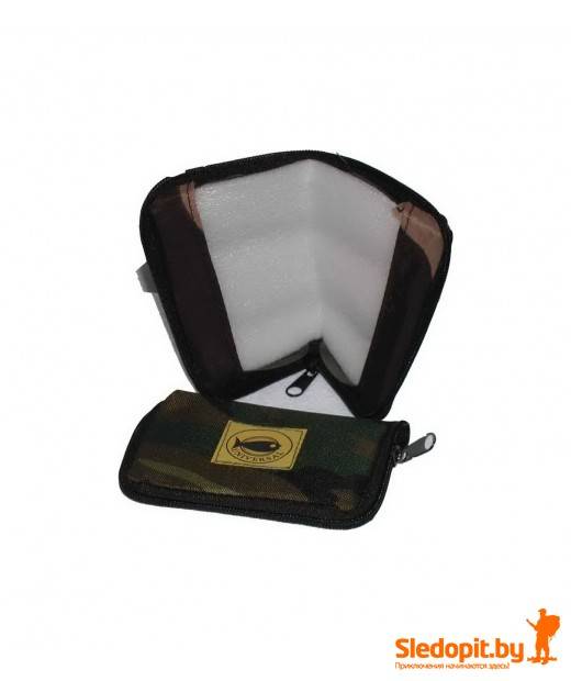 Внутри пенополиэтиленовая вставка, на которую накалываются мормышки, крючки, иск. мушки, блёсны и т. д.