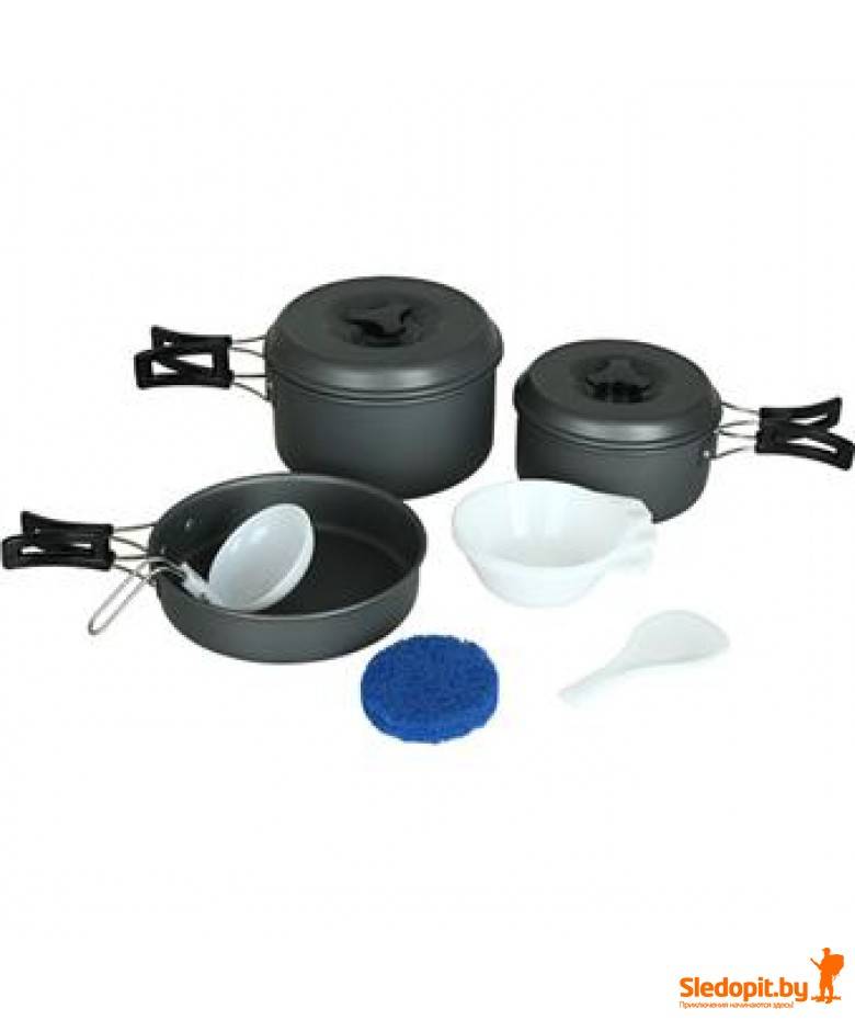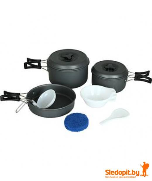 Кроме металлической посуды в комплект входят изготовленные из полипропилена складной половник, ложка-лопатка, а также три глубоких тарелки, которые при необходимости, могут служить и кружками.
